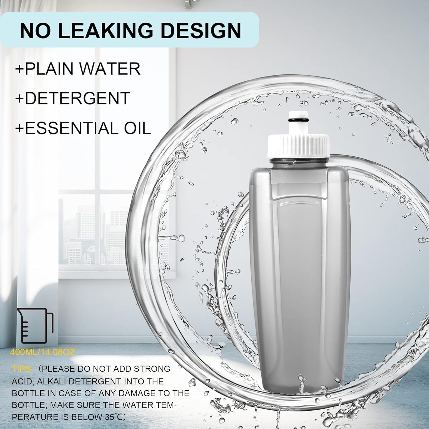 Built with a secure no-leak design, the refillable bottle safely holds plain water, detergent, or essential oil for convenient and mess-free cleaning.